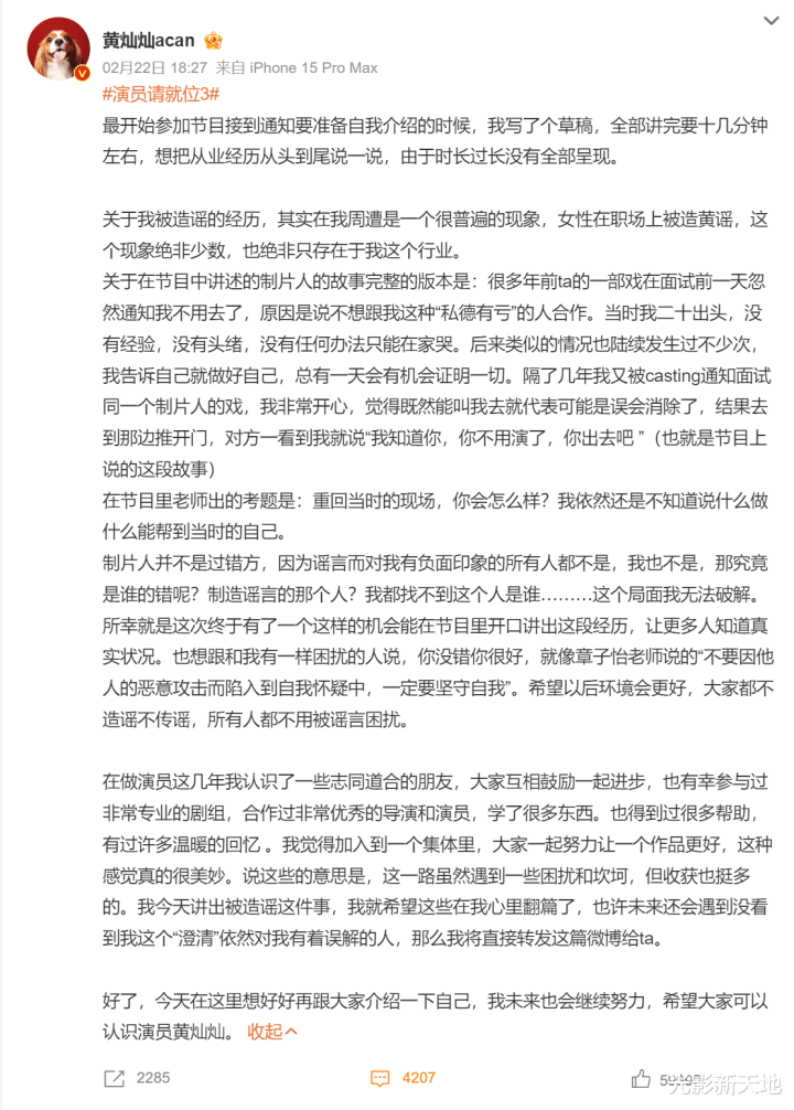 2月22日下午,黄灿灿发长文回应,具体内容大家可以自己看,在这里就不赘述了,写的无非是她被造黄谣、受委屈的那些事儿。重点是两个话外的重要细节。