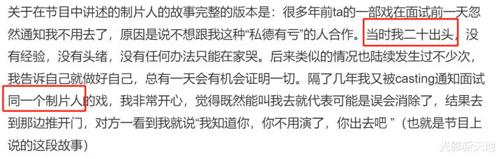 而后面黄灿灿写的额“隔了几年我又被casting通知面试同一个制片人的戏”,结果就遭遇了“我知道你,你不用演了,你出去吧。”虽然黄灿灿没有点名,但很难不让人将她写的制片人和杨晓培对号入座。